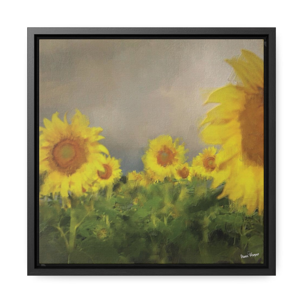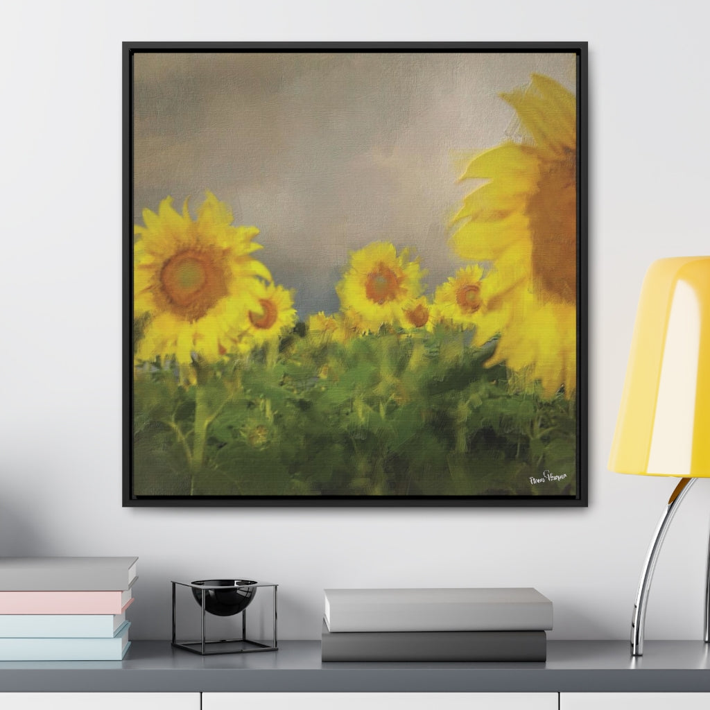Premium quality. Art work is created by Fiona Harper, this Sunflowers image is a unique piece of art. Photographic image custom printed onto canvas in a box frame.