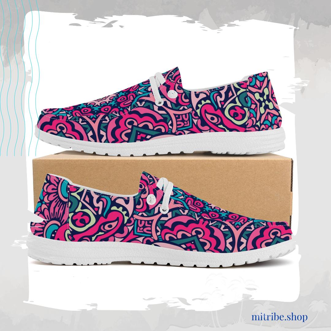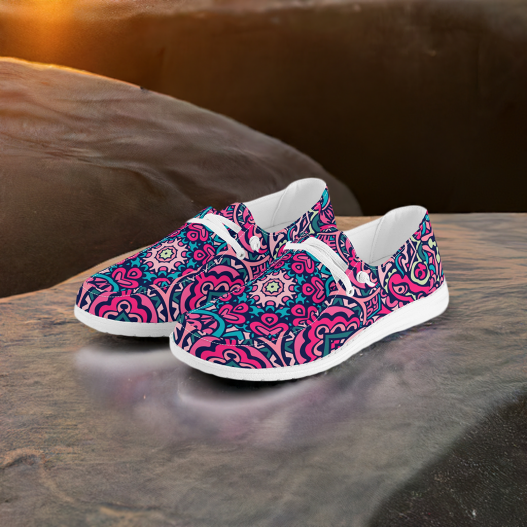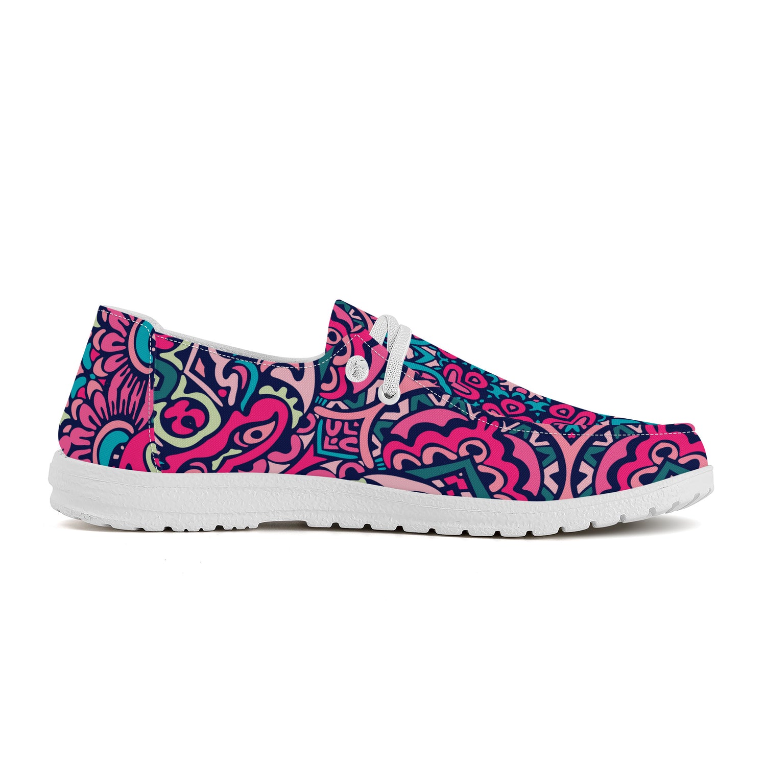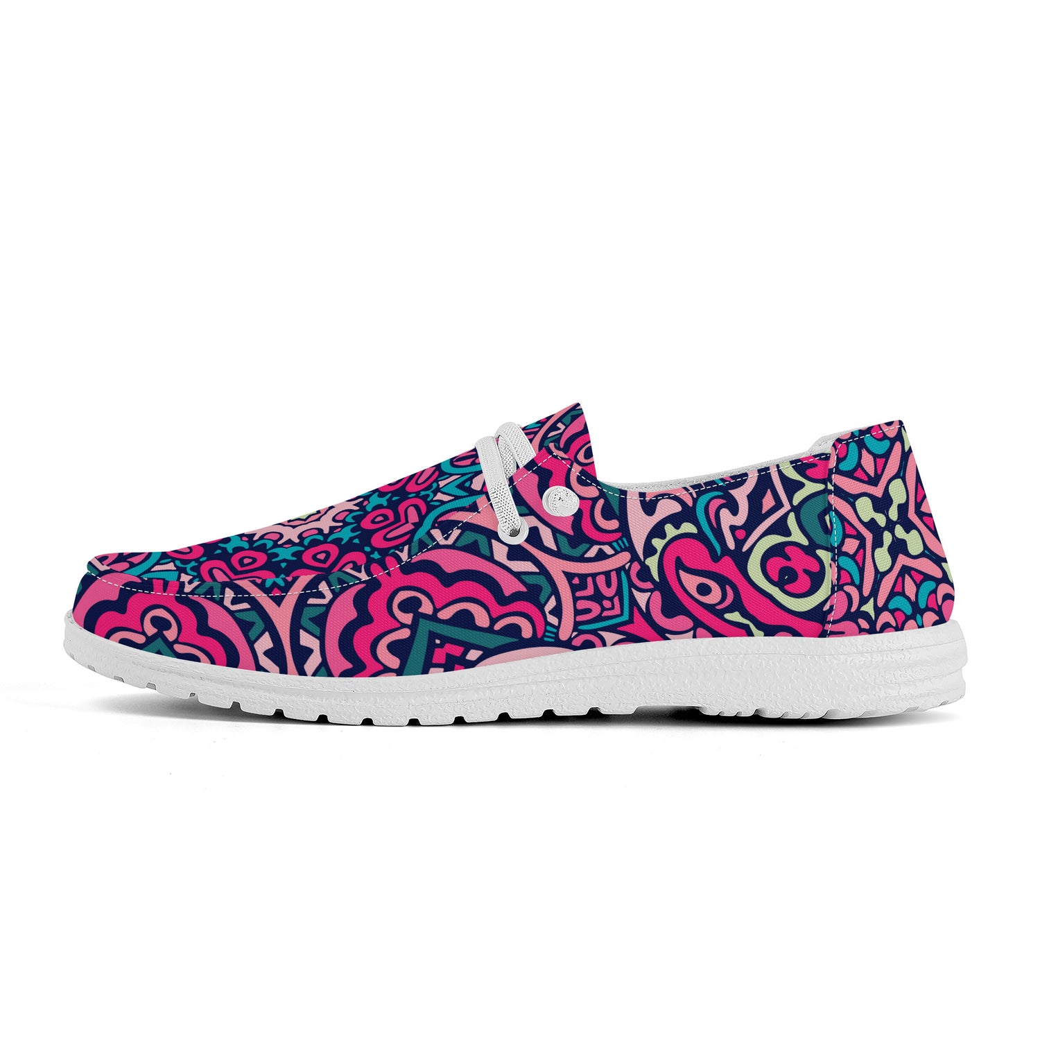 Slip-on lace-up canvas loafer boat shoe. Funky fashion style in a colourful Boho style print. These comfy and stylish casual loafers with white rubber sole are non-marking and perfect for weekend boating.