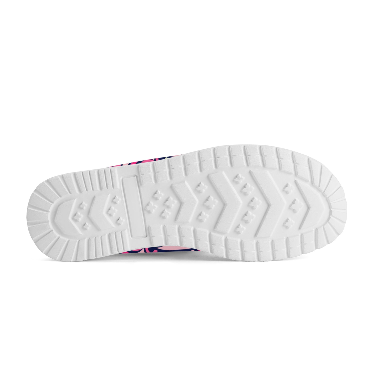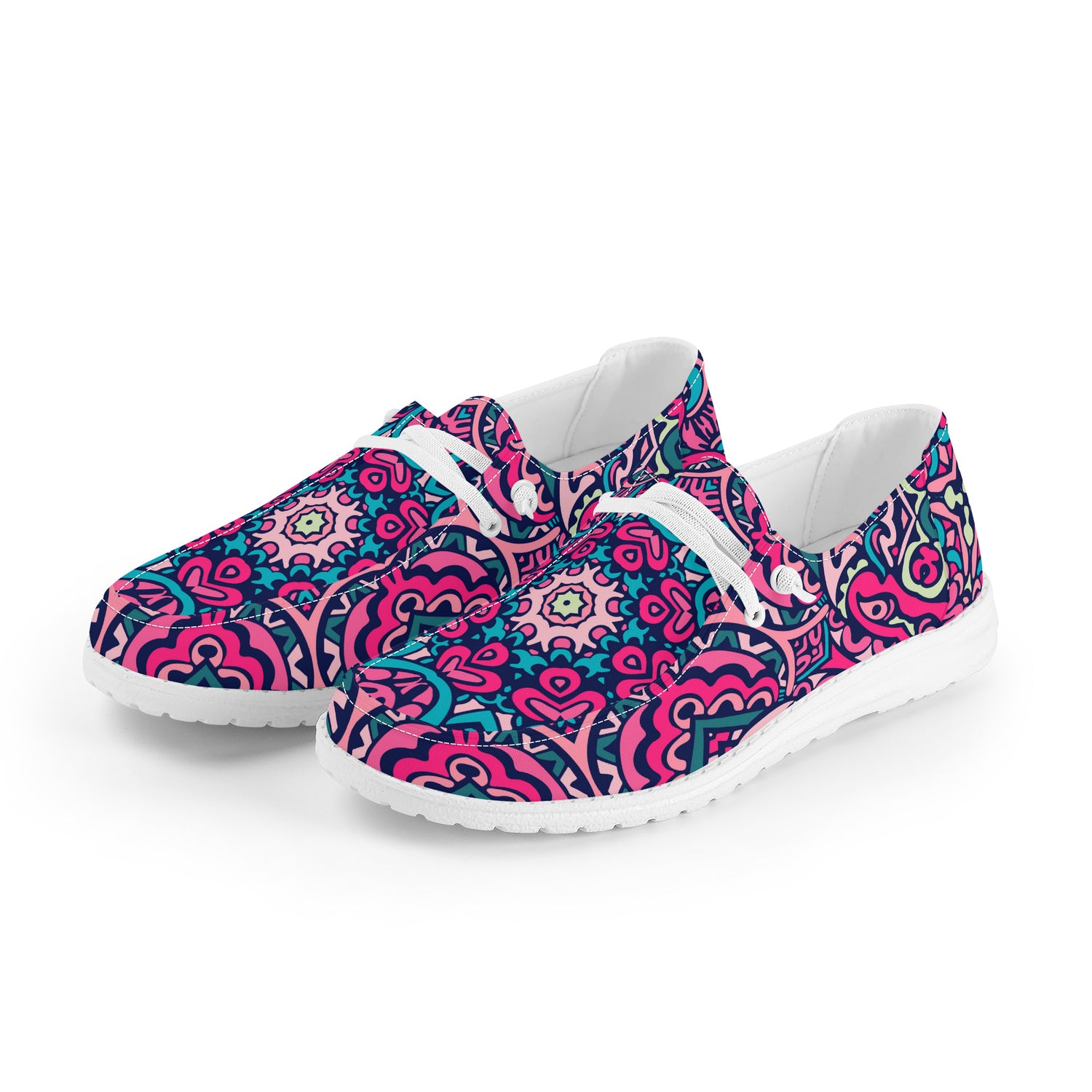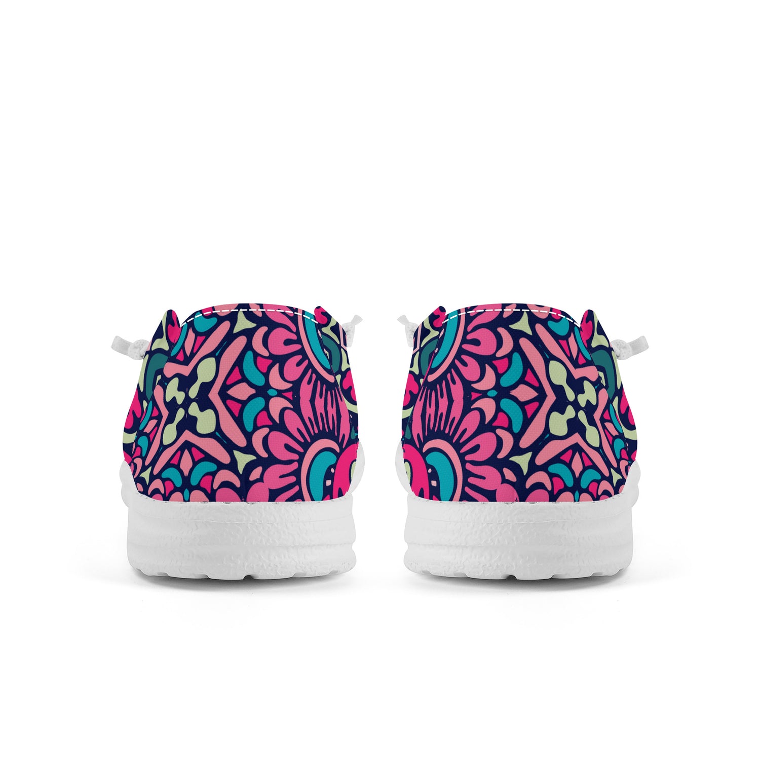 Slip-on lace-up canvas loafer boat shoe. Funky fashion style in a colourful Boho style print. These comfy and stylish casual loafers with white rubber sole are non-marking and perfect for weekend boating.