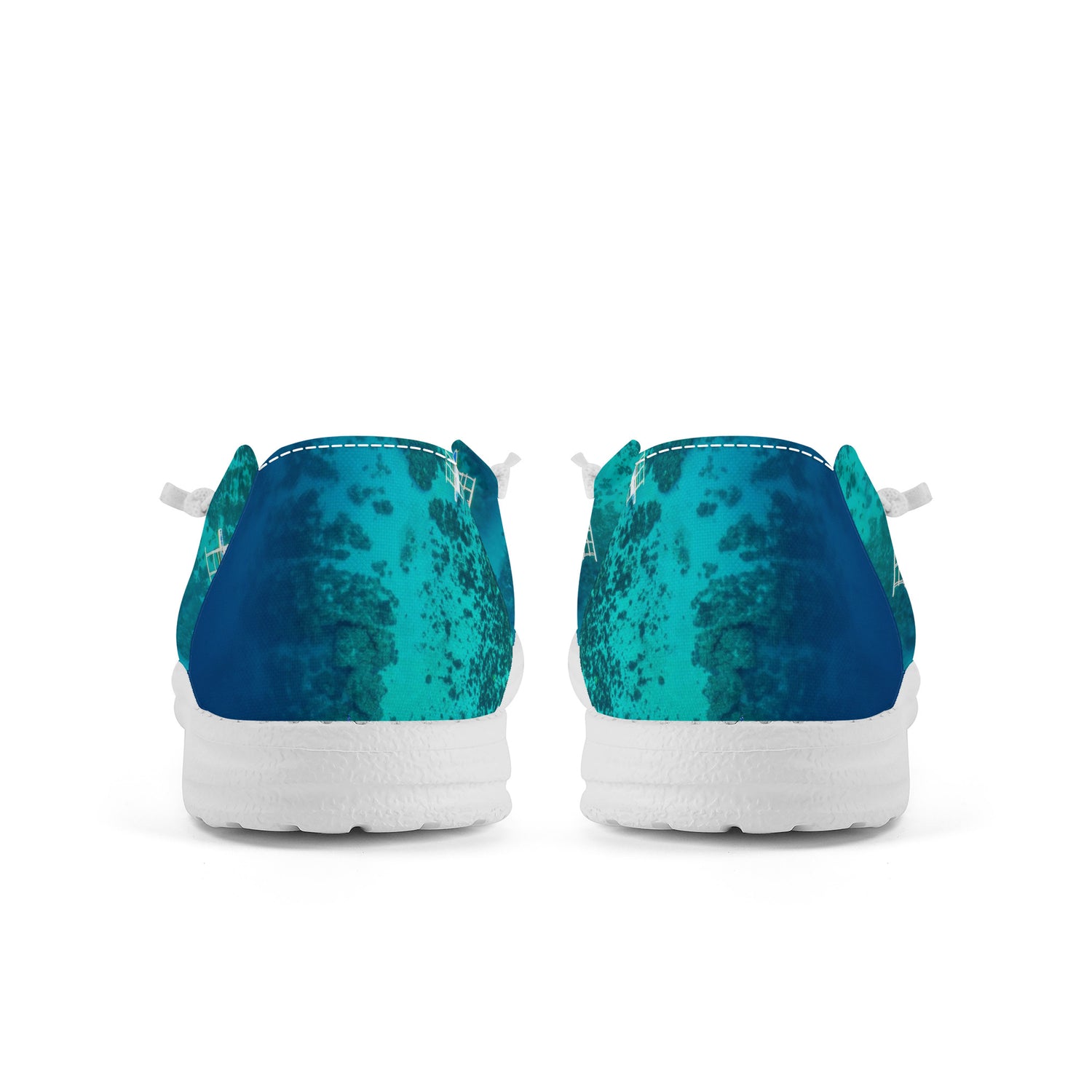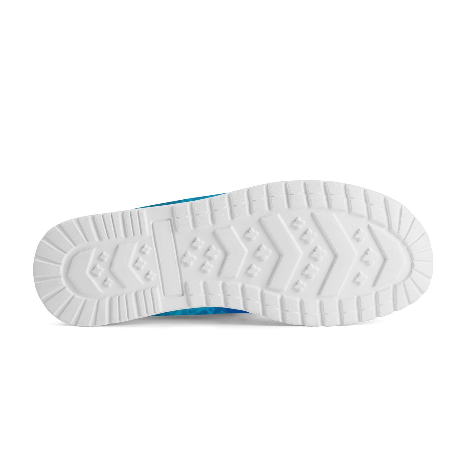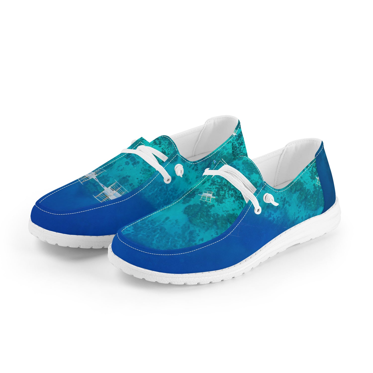 Slip-on lace-up canvas loafer boat shoe. Funky fashion style in ocean blue. These comfy and stylish casual loafers with white rubber sole are non-marking and perfect for weekend boating. Wear them everywhere for maximum walking comfort: for weekends in the country or as your 'go to' everyday staple to make a colourful statement.