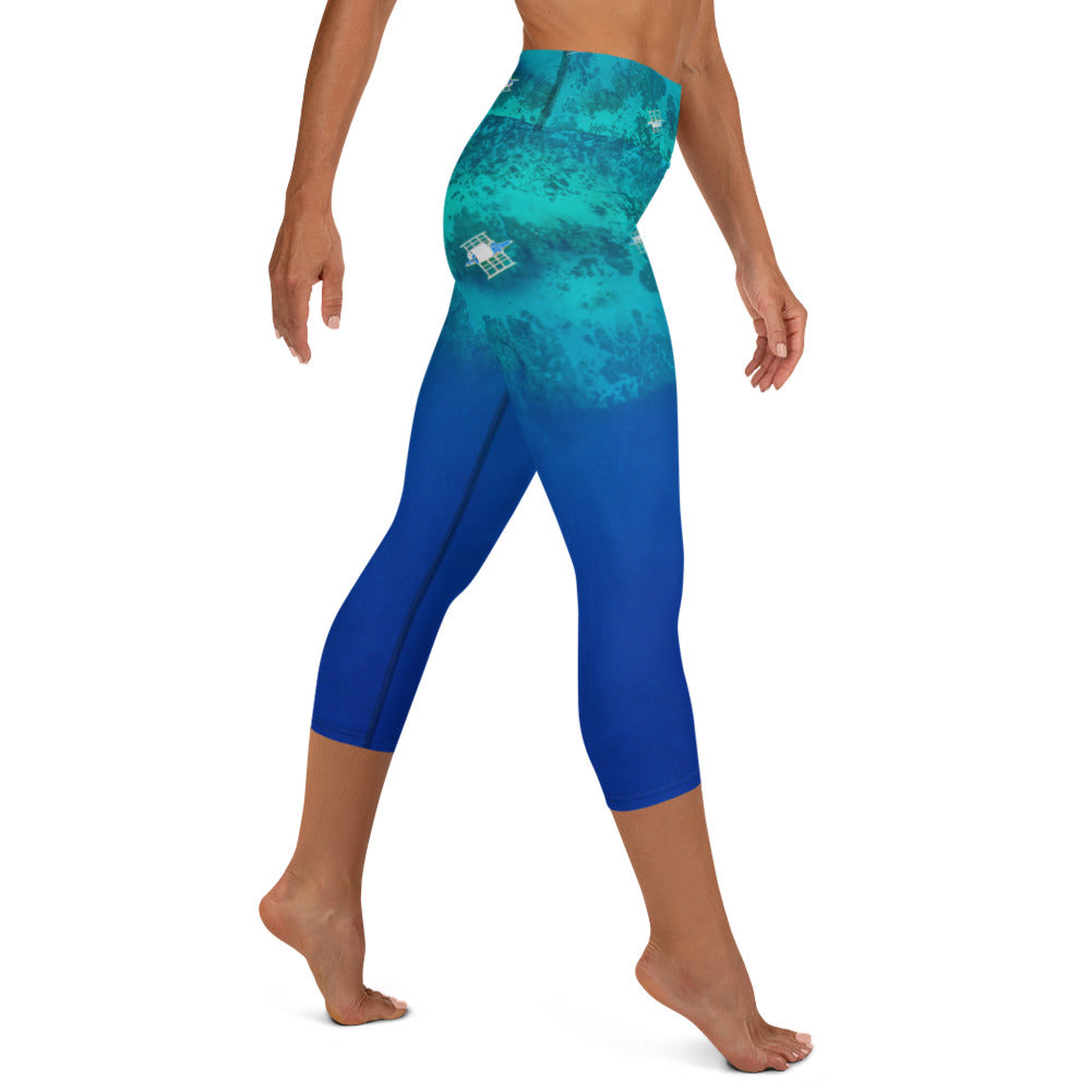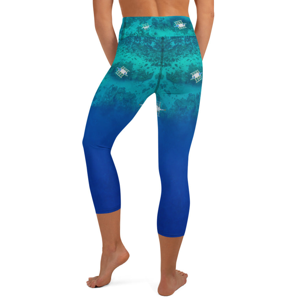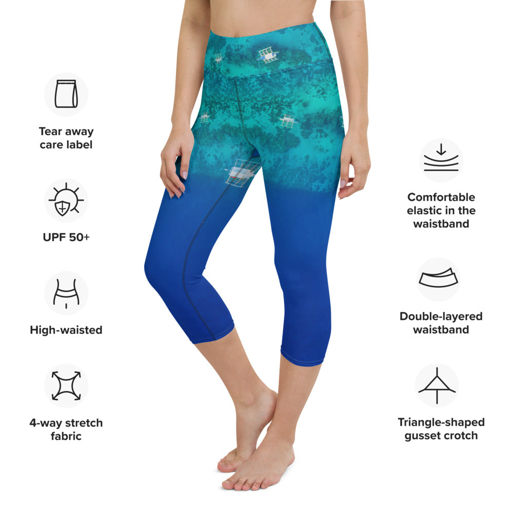 Comfortable and eye-catching in striking blue and aqua colours of the Phillipines sea. Wear these gorgeous mid-calf length leggings for running, walking, in the gym, doing yoga, pilates or as everyday activewear. Inside pocket in rear waistband.- Polyester and spandex fabric